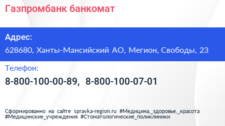 Газпромбанк, банкомат по адресу 628680, Ханты-Мансийский АО, Мегион, Свободы, 23 в дальнейшем Организация, размещена в следующих категориях: