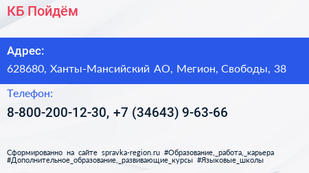 КБ Пойдём! по адресу 628680, Ханты-Мансийский АО, Мегион, Свободы, 38 в дальнейшем Организация, размещена в следующих категориях: