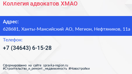 Коллегия адвокатов ХМАО по адресу 628681, Ханты-Мансийский АО, Мегион, Нефтяников, 11а в дальнейшем Организация, размещена в следующих категориях: