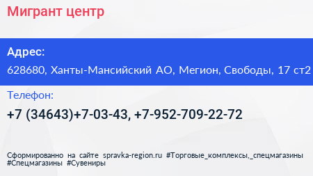 Мигрант центр по адресу 628680, Ханты-Мансийский АО, Мегион, Свободы, 17 ст2 в дальнейшем Организация, размещена в следующих категориях: