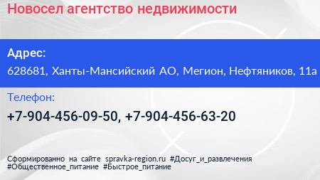 Новосел, агентство недвижимости по адресу 628681, Ханты-Мансийский АО, Мегион, Нефтяников, 11а в дальнейшем Организация, размещена в следующих категориях:
