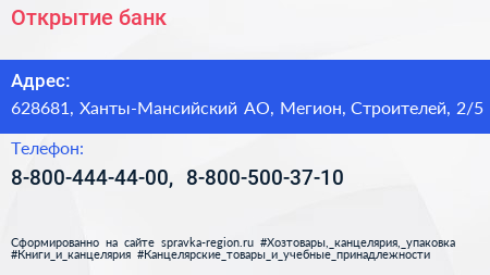 Открытие, банк по адресу 628681, Ханты-Мансийский АО, Мегион, Строителей, 2/5 в дальнейшем Организация, размещена в следующих категориях: