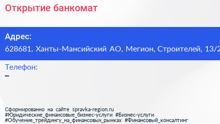 Открытие, банкомат по адресу 628681, Ханты-Мансийский АО, Мегион, Строителей, 13/2 в дальнейшем Организация, размещена в следующих категориях: