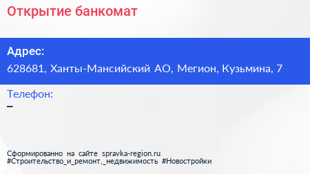 Открытие, банкомат по адресу 628681, Ханты-Мансийский АО, Мегион, Кузьмина, 7 в дальнейшем Организация, размещена в следующих категориях: