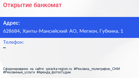 Открытие, банкомат по адресу 628684, Ханты-Мансийский АО, Мегион, Губкина, 1 в дальнейшем Организация, размещена в следующих категориях: