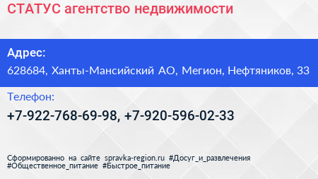 СТАТУС, агентство недвижимости по адресу 628684, Ханты-Мансийский АО, Мегион, Нефтяников, 33 в дальнейшем Организация, размещена в следующих категориях: