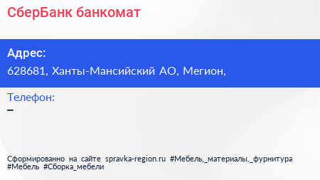 СберБанк, банкомат по адресу 628681, Ханты-Мансийский АО, Мегион, в дальнейшем Организация, размещена в следующих категориях: