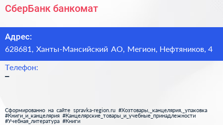 СберБанк, банкомат по адресу 628681, Ханты-Мансийский АО, Мегион, Нефтяников, 4 в дальнейшем Организация, размещена в следующих категориях:
