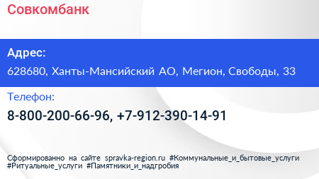 Совкомбанк по адресу 628680, Ханты-Мансийский АО, Мегион, Свободы, 33 в дальнейшем Организация, размещена в следующих категориях: