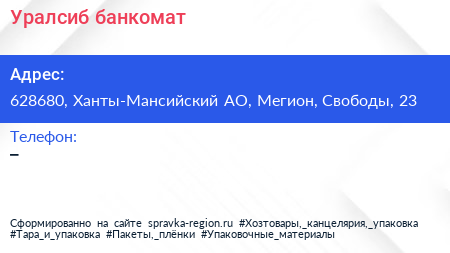 Уралсиб, банкомат по адресу 628680, Ханты-Мансийский АО, Мегион, Свободы, 23 в дальнейшем Организация, размещена в следующих категориях: