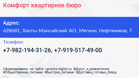 Комфорт, квартирное бюро по адресу 628681, Ханты-Мансийский АО, Мегион, Нефтяников, 7 в дальнейшем Организация, размещена в следующих категориях: