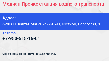 Медиан-Проикс, станция водного транспорта по адресу 628680, Ханты-Мансийский АО, Мегион, Береговая, 1 в дальнейшем Организация, размещена в следующих категориях: