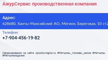 АжурСервис, производственная компания по адресу 628680, Ханты-Мансийский АО, Мегион, Береговая, 10 ст2 в дальнейшем Организация, размещена в следующих категориях: