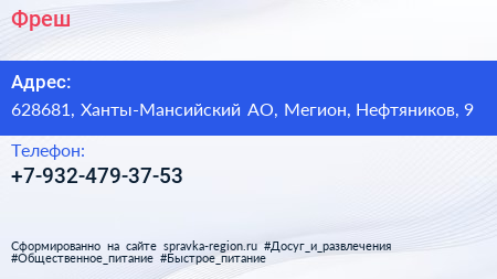 Фреш по адресу 628681, Ханты-Мансийский АО, Мегион, Нефтяников, 9 в дальнейшем Организация, размещена в следующих категориях: