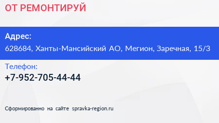 ОТ`РЕМОНТИРУЙ по адресу 628684, Ханты-Мансийский АО, Мегион, Заречная, 15/3 в дальнейшем Организация, размещена в следующих категориях: