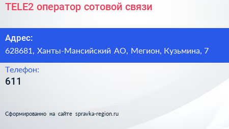 TELE2, оператор сотовой связи по адресу 628681, Ханты-Мансийский АО, Мегион, Кузьмина, 7 в дальнейшем Организация, размещена в следующих категориях: