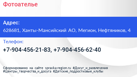Фотоателье по адресу 628681, Ханты-Мансийский АО, Мегион, Нефтяников, 4 в дальнейшем Организация, размещена в следующих категориях: