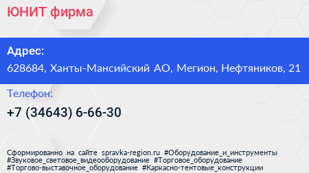 ЮНИТ, фирма по адресу 628684, Ханты-Мансийский АО, Мегион, Нефтяников, 21 в дальнейшем Организация, размещена в следующих категориях: