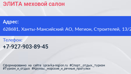 ЭЛИТА, меховой салон по адресу 628681, Ханты-Мансийский АО, Мегион, Строителей, 13/2 в дальнейшем Организация, размещена в следующих категориях: