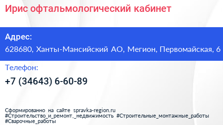 Ирис, офтальмологический кабинет по адресу 628680, Ханты-Мансийский АО, Мегион, Первомайская, 6 в дальнейшем Организация, размещена в следующих категориях: