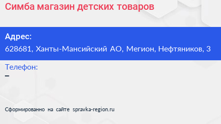 Симба, магазин детских товаров по адресу 628681, Ханты-Мансийский АО, Мегион, Нефтяников, 3 в дальнейшем Организация, размещена в следующих категориях: