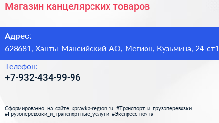 Магазин канцелярских товаров по адресу 628681, Ханты-Мансийский АО, Мегион, Кузьмина, 24 ст1 в дальнейшем Организация, размещена в следующих категориях:
