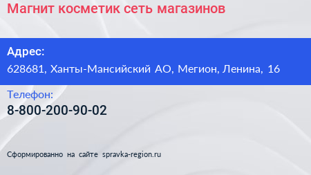 Магнит косметик, сеть магазинов по адресу 628681, Ханты-Мансийский АО, Мегион, Ленина, 16 в дальнейшем Организация, размещена в следующих категориях: