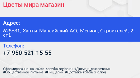 Цветы мира, магазин по адресу 628681, Ханты-Мансийский АО, Мегион, Строителей, 2 ст1 в дальнейшем Организация, размещена в следующих категориях:
