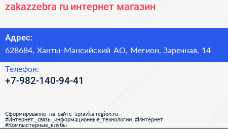zakazzebra.ru, интернет-магазин по адресу 628684, Ханты-Мансийский АО, Мегион, Заречная, 14 в дальнейшем Организация, размещена в следующих категориях: