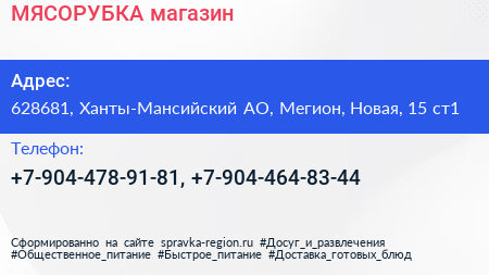 МЯСОРУБКА, магазин по адресу 628681, Ханты-Мансийский АО, Мегион, Новая, 15 ст1 в дальнейшем Организация, размещена в следующих категориях: