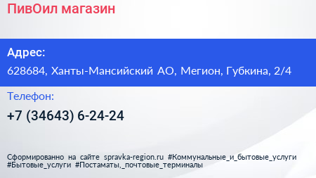 ПивОил, магазин по адресу 628684, Ханты-Мансийский АО, Мегион, Губкина, 2/4 в дальнейшем Организация, размещена в следующих категориях:
