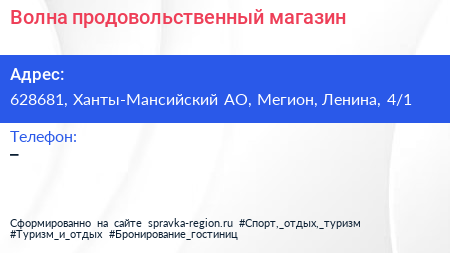 Волна, продовольственный магазин по адресу 628681, Ханты-Мансийский АО, Мегион, Ленина, 4/1 в дальнейшем Организация, размещена в следующих категориях:
