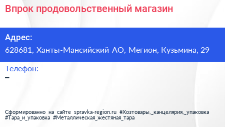 Впрок, продовольственный магазин по адресу 628681, Ханты-Мансийский АО, Мегион, Кузьмина, 29 в дальнейшем Организация, размещена в следующих категориях: