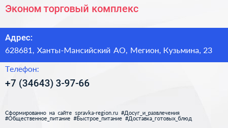 Эконом, торговый комплекс по адресу 628681, Ханты-Мансийский АО, Мегион, Кузьмина, 23 в дальнейшем Организация, размещена в следующих категориях: