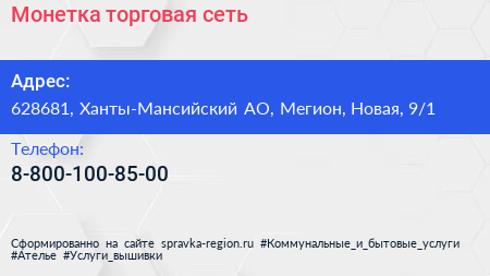 Монетка, торговая сеть по адресу 628681, Ханты-Мансийский АО, Мегион, Новая, 9/1 в дальнейшем Организация, размещена в следующих категориях: