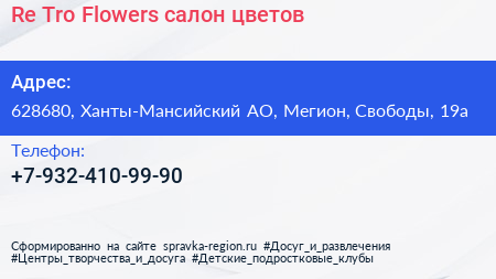 Re.Tro Flowers, салон цветов по адресу 628680, Ханты-Мансийский АО, Мегион, Свободы, 19а в дальнейшем Организация, размещена в следующих категориях: