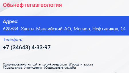 Обьнефтегазгеология по адресу 628684, Ханты-Мансийский АО, Мегион, Нефтяников, 14 в дальнейшем Организация, размещена в следующих категориях: