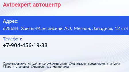 Avtoexpert, автоцентр по адресу 628684, Ханты-Мансийский АО, Мегион, Западная, 12 ст4 в дальнейшем Организация, размещена в следующих категориях:
