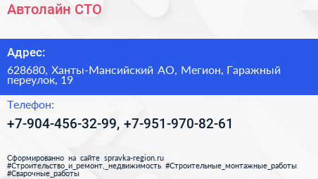 Автолайн, СТО по адресу 628680, Ханты-Мансийский АО, Мегион, Гаражный переулок, 19 в дальнейшем Организация, размещена в следующих категориях: