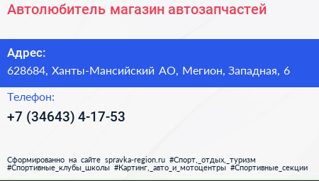 Автолюбитель, магазин автозапчастей по адресу 628684, Ханты-Мансийский АО, Мегион, Западная, 6 в дальнейшем Организация, размещена в следующих категориях:
