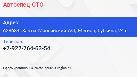 Автоспец, СТО по адресу 628684, Ханты-Мансийский АО, Мегион, Губкина, 24а в дальнейшем Организация, размещена в следующих категориях: