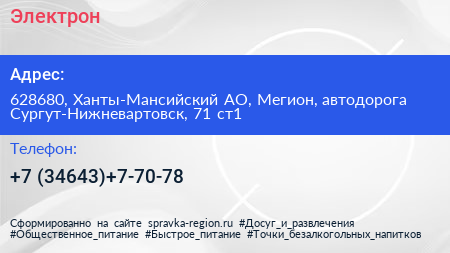 Электрон по адресу 628680, Ханты-Мансийский АО, Мегион, автодорога Сургут-Нижневартовск, 71 ст1 в дальнейшем Организация, размещена в следующих категориях: