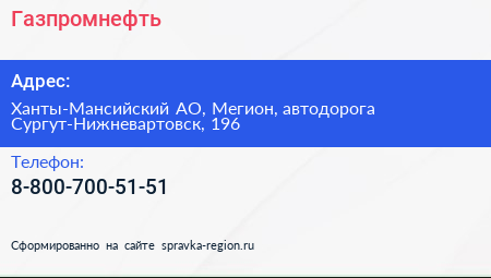 Газпромнефть по адресу Ханты-Мансийский АО, Мегион, автодорога Сургут-Нижневартовск, 196 в дальнейшем Организация, размещена в следующих категориях: