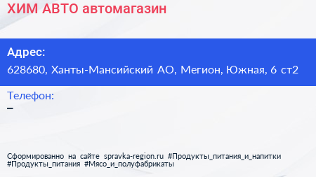 ХИМ-АВТО, автомагазин по адресу 628680, Ханты-Мансийский АО, Мегион, Южная, 6 ст2 в дальнейшем Организация, размещена в следующих категориях: