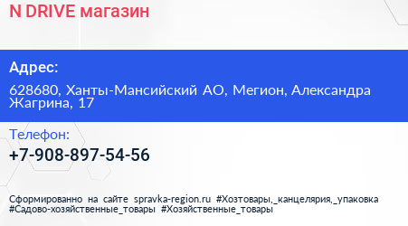 N-DRIVE, магазин по адресу 628680, Ханты-Мансийский АО, Мегион, Александра Жагрина, 17 в дальнейшем Организация, размещена в следующих категориях: