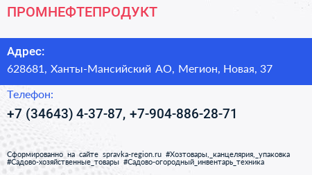 ПРОМНЕФТЕПРОДУКТ по адресу 628681, Ханты-Мансийский АО, Мегион, Новая, 37 в дальнейшем Организация, размещена в следующих категориях: