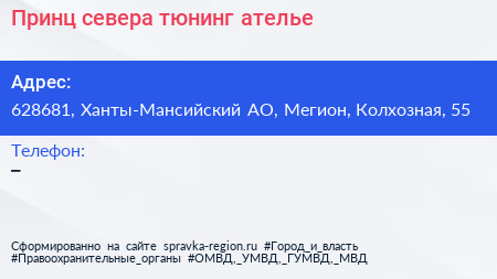 Принц севера, тюнинг-ателье по адресу 628681, Ханты-Мансийский АО, Мегион, Колхозная, 55 в дальнейшем Организация, размещена в следующих категориях: