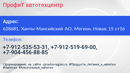 ПрофиТ, автотехцентр по адресу 628681, Ханты-Мансийский АО, Мегион, Новая, 15 ст16 в дальнейшем Организация, размещена в следующих категориях: