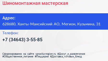 Шиномонтажная мастерская по адресу 628680, Ханты-Мансийский АО, Мегион, Кузьмина, 31 в дальнейшем Организация, размещена в следующих категориях: