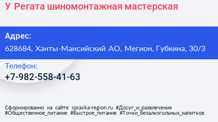 У Регата, шиномонтажная мастерская по адресу 628684, Ханты-Мансийский АО, Мегион, Губкина, 30/3 в дальнейшем Организация, размещена в следующих категориях: